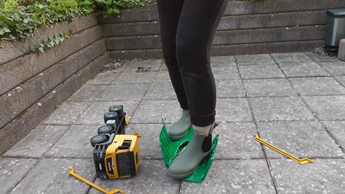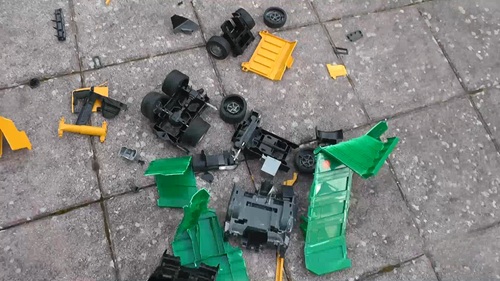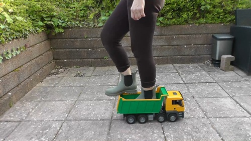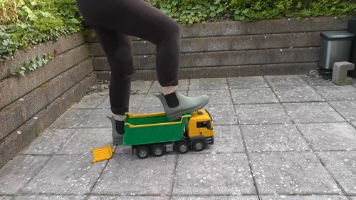 Akira received a large Bruder truck from a fan for crushing. Wearing her rubber boots, she walks over the vehicle several times with her full weight before she begins to mercilessly demolish the truck to bits and pieces.