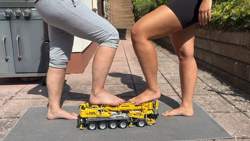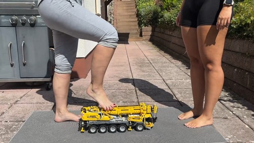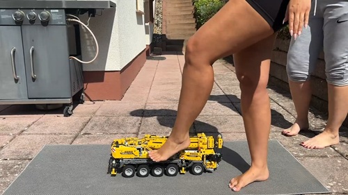 Akira and Mia do enjoy barefoot crushing, so today they play with a large Lego toy crane. In the end, they put on flip-flops to pulverize the truck into even tinier pieces.