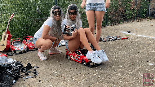 Part 4: Now it is time for some barefoot crushing. The girls decide to take a large remote controlled racing car in scale 1:6 and walk over it barefoot several times to test its stability. They also step jointly on the racer to see if it can take their weight.