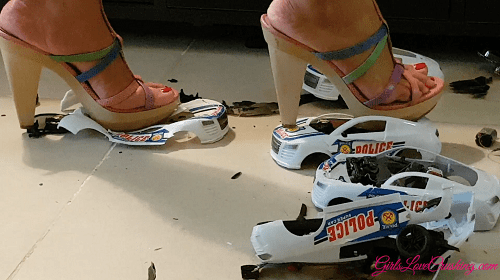 Analyn meets 3 police cars wearing her wooden sandals and doesn't hesitate for long before she starts demolishing the cars. As the cars get so easily smashed under her soles, she also adds the remains of the police cars from the previous crush clips and cruhes them all together. In the end only a pile of plastic trash remains.