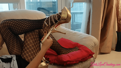 Analyn is relaxing on the couch, wearing her golden high heels and a pair of black pantyhose. As she is bored, she decides to destroy her high heels by cutting them off her feet with a pair of scissors. You can see on her face that she really enjoys it. Once the shoes are destroyed, she starts cutting and ripping her stockings completely to shreds.