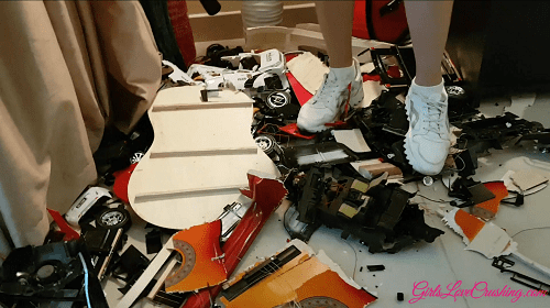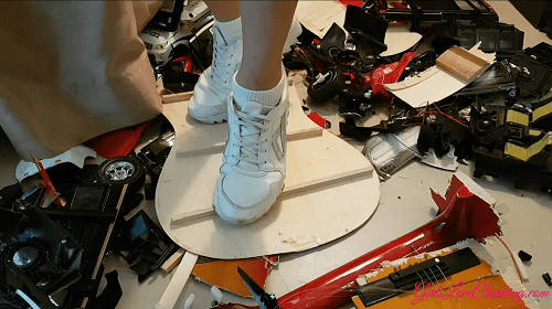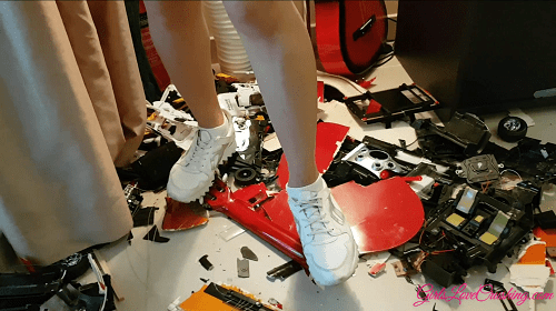 Anastasija is wearing her white sneakers and steps on the scrap pile, which she has created out of the destroyed material from her previous crush videos (containing plenty of car parts, guitar remains, etc.). As there are also still some bigger remains, she crushes them completely so nobody will ever be able to identify, what theses things have been once.