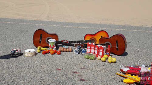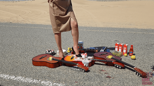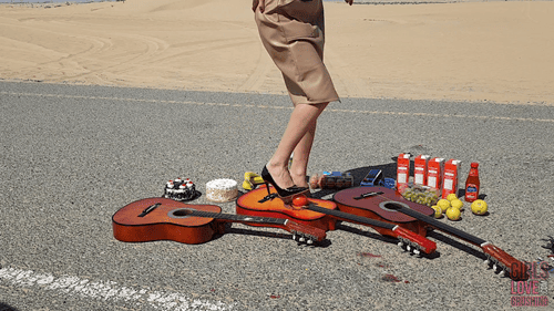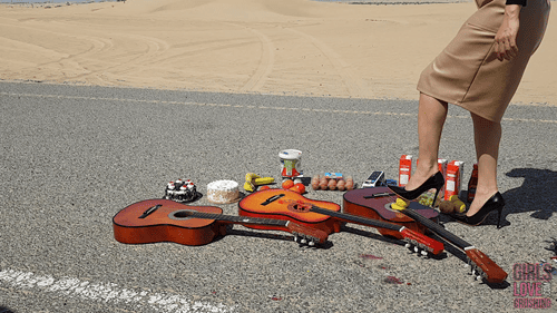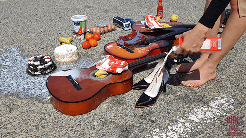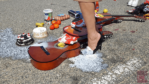 She begins by using the guitars as a juicer, pressing different fruits through the guitar strings. Next Anastasija decides to flood the guitars with milk, piercing several milk cartons with her high heels to ensure a proper and controlled flow. And, since it is a very hot day, she also pours some milk in her pumps to cool down her feet.