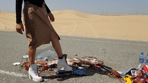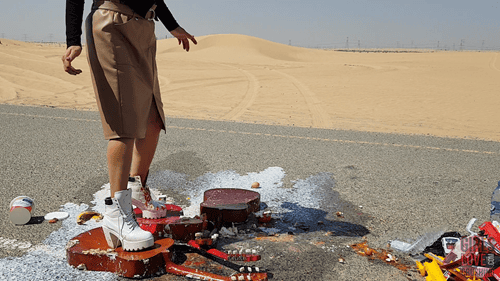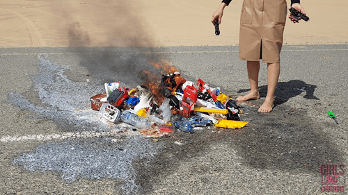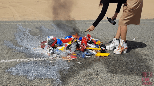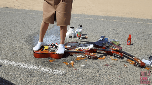 To make the mess complete, Anastasija finally decides to shower the guitars and her boots with yogurt, ketchup and water before crushing the guitars and two remaining toy cars. Eventually she sets the entire pile of trash on fire (guitars, model cars, trains, inflatables, stuffed animals as well as her boots and socks) until only a small pile of ash is left in the end!