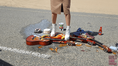 Anastasija continues showering the guitars with raw eggs before putting on her white plateau boots and playing further juicer games with tomatoes, bananas and other fruits. Then it is cake time and as Anastasija wants to feel the cake texture properly, she decides to take her boots off and crush the cakes with her white socks; followed by some grapes.