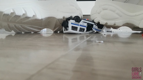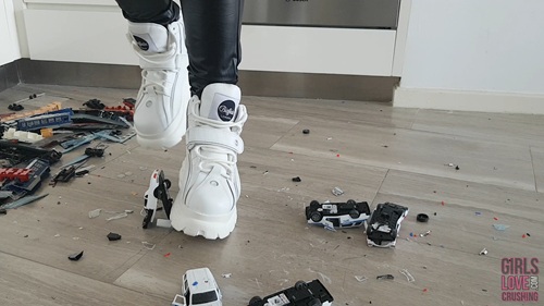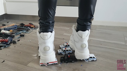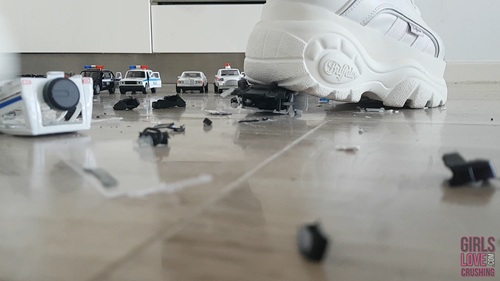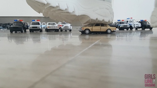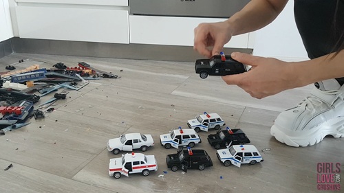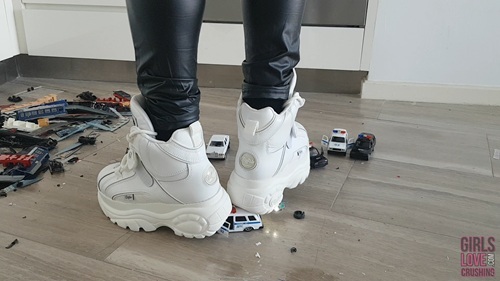 Part 2: Once the model trains are all gone, a fleet of 10 small police and ambulance cars are Anastasija’s next challenge. This sounds like an easy task for her Buffalo boots, however the cars are made out of metal and therefore are a lot tougher than originally expected, even for such an experienced crush girl like Anastasija.