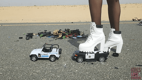 Are you ready to watch me obliterate three police toy cars under the rough soles of my heavy boots? Come and enjoy the fun with me!