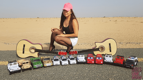 Crush bitch Anastasija received a large box with 13 toy cars and 2 guitars from a fan. The request: Crush the items with several pairs of shoes, wearing nylons.