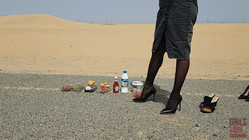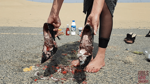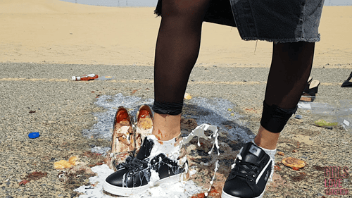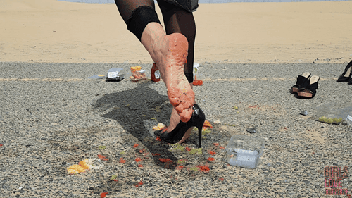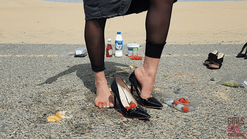 Summer has come to an end, so Anastasija determined to do a final food crush and shoe burning session outdoors. Cakes, muffins, grapes, strawberries, tomatoes, milk and yoghurt are ending under and in her black high heels. Anastasija even rips her nylons to get a better feeling of the texture under her bare feet, creating a big mess.