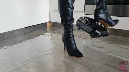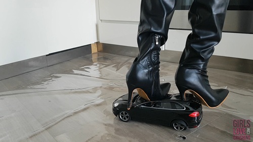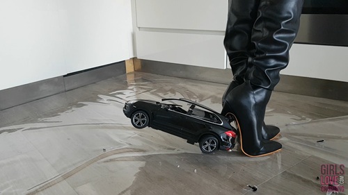 Anastasija received a large remote controlled Porsche Cayenne model car from a fan; unfortunately the SUV came without any batteries to play with. While matching her brand new leather overknee boots with the car, one of Anastasija’s heels gets heavily stuck in the car body, creating quite some damage to the leather heel.