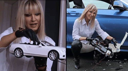 Neither model has a chance of escape; they get completely crushed. Carina also hits both cars with full force, so that in the end, only a huge pile of junk remains.