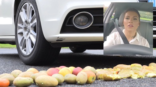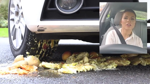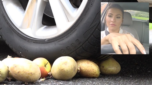 Today Dark Star has fun crushing food with her car. She enjoys driving over a large amount of apples, potatoes and tangerines and flatten them under the wheels of her car, creating quite a mess.