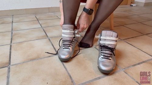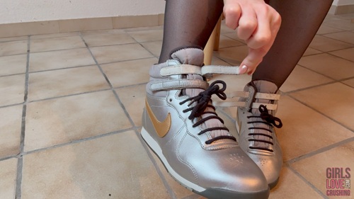 Custom Clip: Desiree received a new pair of Nike sneakers from a fan. She is very eager to try them on, especially since the shoes go very well with her black stockings and also come both with a lace and velcro fastener. Desiree enjoys putting on the shoes several times and in different styles to see which one suits her best.