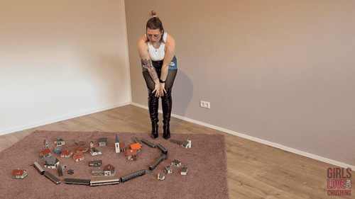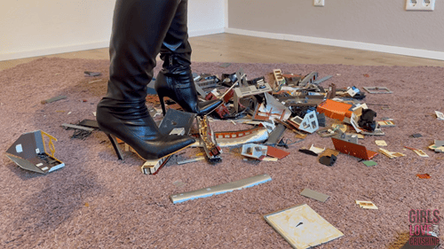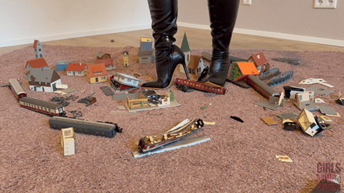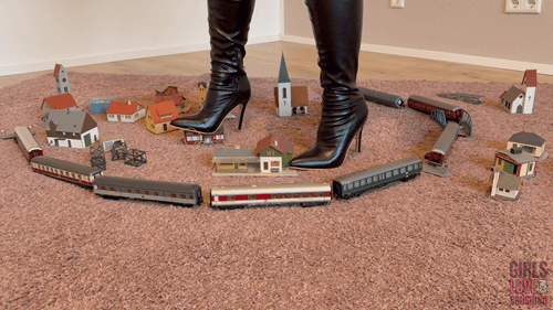 The sound of the breaking plastic underneath the soles of my overknee-boots is just awesome and so satisfying, that I decide to destroy the entire valuable train collection. It feels amazing how everything crumbles to dust under my heels and I really enjoy it; knowing how much pain it will cause him.