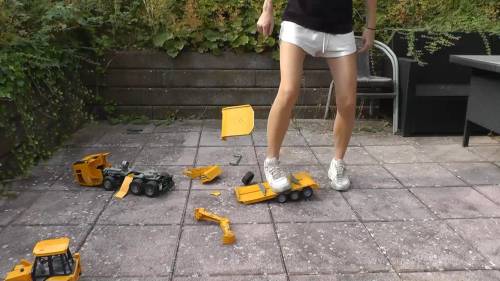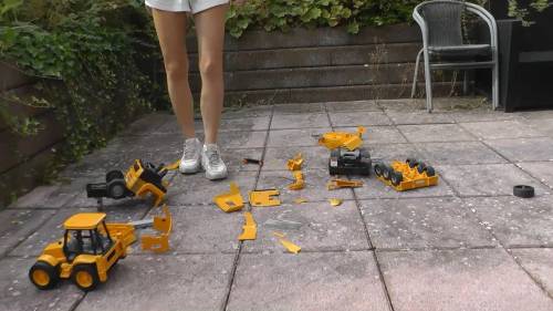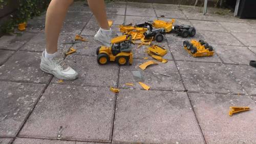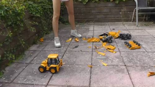 Big Bruder toy truck crush by Doro: She obliterates the truck and the excavator completely into many little pieces with her white sneakers.