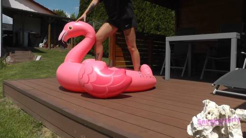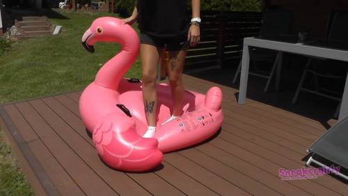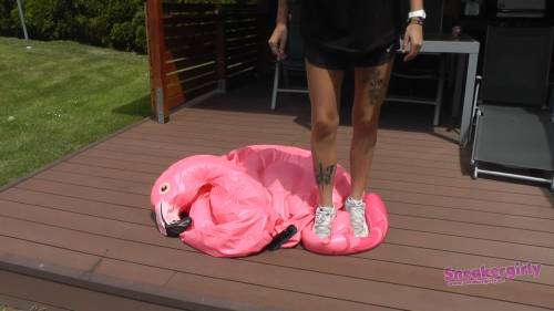 Doro plays with a large inflatable flamingo outdoors when she realizes, that her white sneaker socks have become quite dirty. Hence she decides to put on her sneakers and stomp the inflatable until it is completely destroyed.