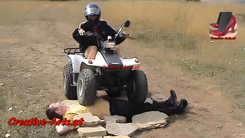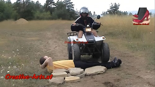 Eine Frau fährt mit ihrem Quad immer wieder über einen Mann.