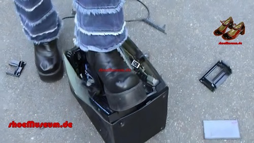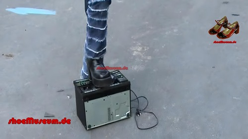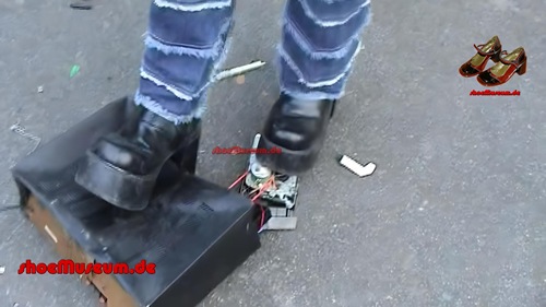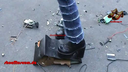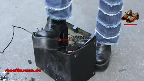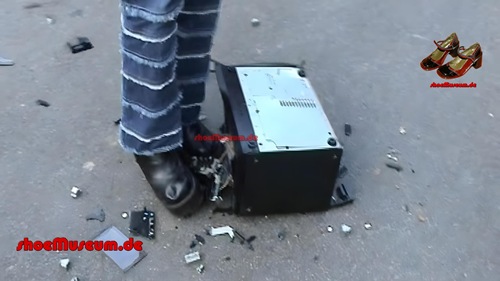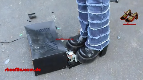 She kicks a stereo hi-fi system and destroys it under her boots.