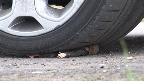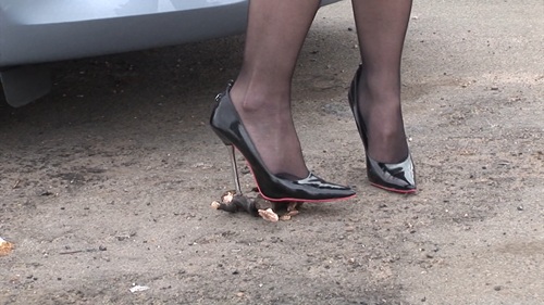 Part 3: Ice and Jo want to have further crush fun, so they decide to obliterate a tiny miniman. Ice kicks the toy in front of the large car wheel wit her high heels before Jo has amazing pleasure driving over it multiple times. Eventually Ice uses the miniman as ashtray for her cigarette whilst Jo digs her heels into the toy.