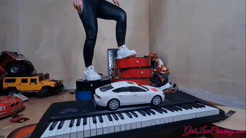 Part 2: Ivy continues the crush party by obliterating a large crane truck with her Fila Disruptor sneakers. After arranging cars and keyboards on some guitars, she uses the pile of remaining guitars as staircase once again to jump on all the items. Then it is time for some larger toy cars, further keyboards and guitars (which are arranged as a bridge as Ivy wants to test if they can withstand her weight).