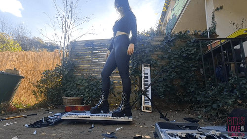After walking over the first keyboard in socks, I decide to sit on it while ripping out the keys with my hands. To speed up the destruction, I put on my black gothic plateau boots which match very well with my wetlook leggings. With those shoes, I can really stomp your shit to bits and pieces.