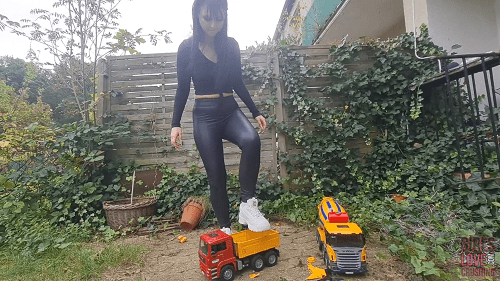 A fan sent me several large Bruder toy trucks, knowing how much I love crushing those. I put on my white Fila Disruptor sneakers and deliberately smash one truck after another. The plastic just crumbles to dust when I jump on the sturdy parts and I do enjoy the entire action a lot!