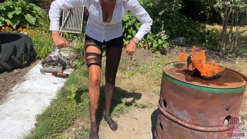 When she eventually makes it out, her shoes are completely messy so Jenn decides to just burn them as she doesn’t want to wear them again. Her black pantyhose have also suffered from the incident; hence Jenn has a blast to rip them off and adds them to the fire, too.
