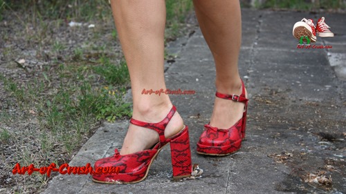 Eine schöne junge Frau trägt zuerst rote und später schwarze Sandalen.
