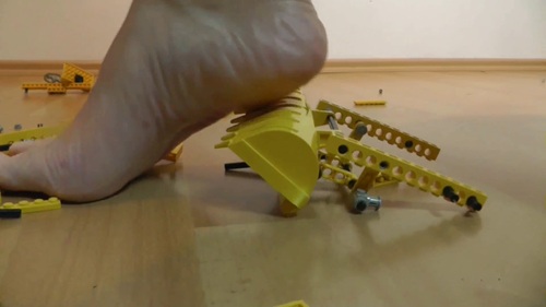 Lolita received an already assembled Lego excavator. Although the bricks are spikey, she has no issues crushing the digger with her bare feet into tiny pieces.