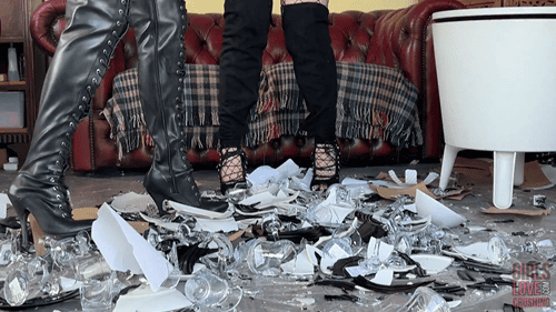 The two ladies come up with different ideas on how to smash the entire lot. Starting slowly, the scene soon develops into a huge mess. Is there anything more fun than smashing dishes and crushing it with heels? Keep the plates and glasses flying, girls!