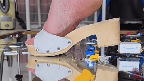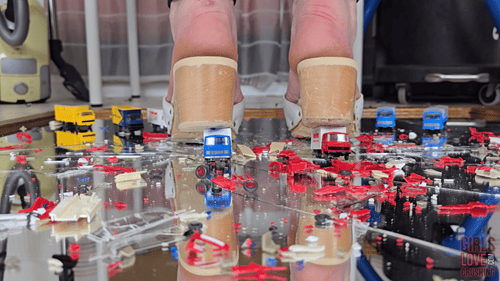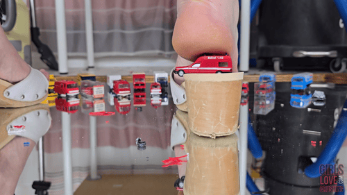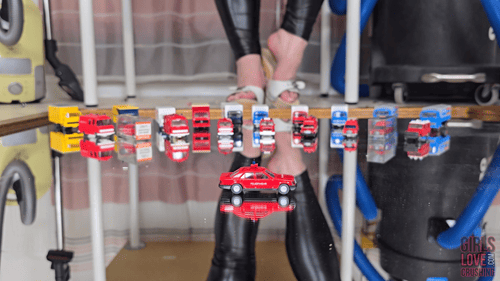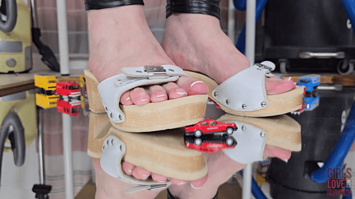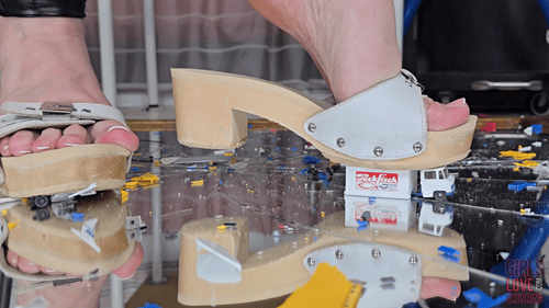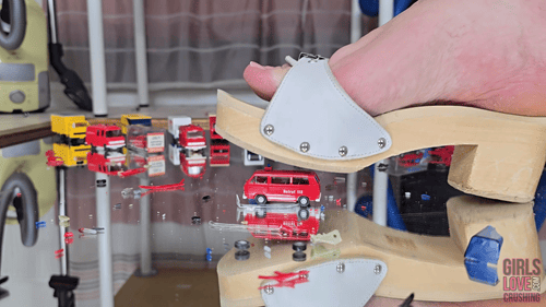 Part 7: This valuable fleet of tiny model cars has to go next. Mila just loves how detailed these models are made and how great it sounds when a car bursts into a thousand pieces under her wooden Scholl mules. Some cars even end up between her bare feet and shoes or get simultaniously destroyed by slowly applying weight on them.