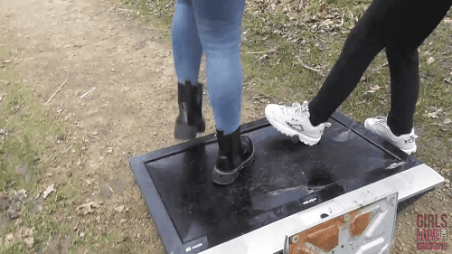 Nicole and her friend Tori come across a television, which has been left on a pathway in the woods. The two young girls are feeling a little bored, so they decide it will be lots of fun to absolutely demolish and fuck the stupid tv up, until there is nothing left. Using only their Fila Disruptor Sneakers and River Island boots, the girls do an amazing job jumping and crushing the tv to bits and pieces.