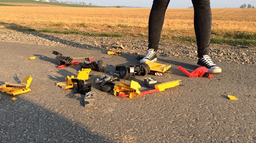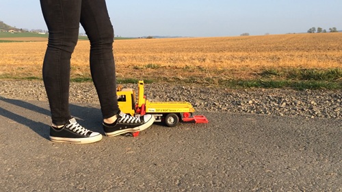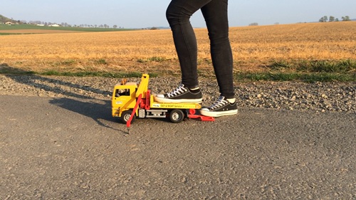 In this clip the model destroys a Bruder towing truck with her black Converse sneakers.