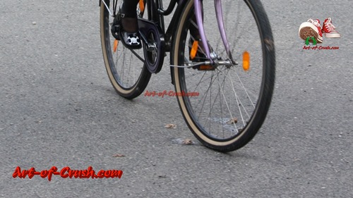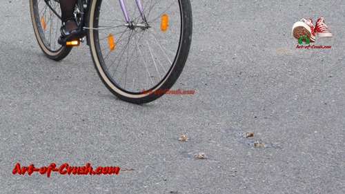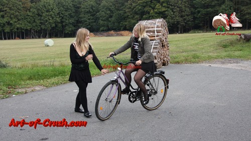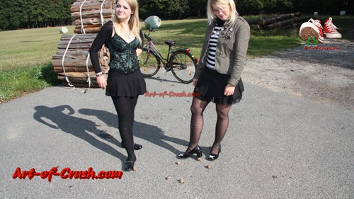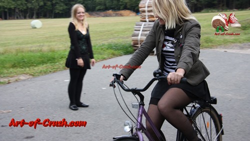 Zwei junge Frauen crushen Schnecken mit dem Fahrrad und den Füßen.