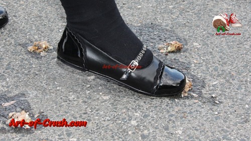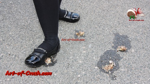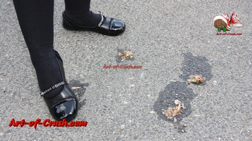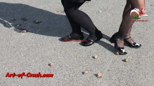 Two girls are crushing snails by riding over them with their bike and stepping on them.