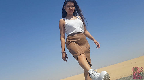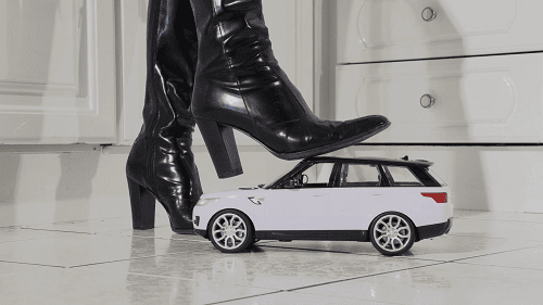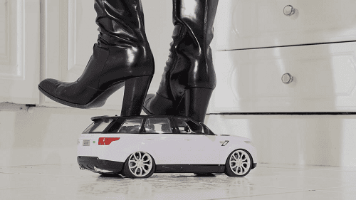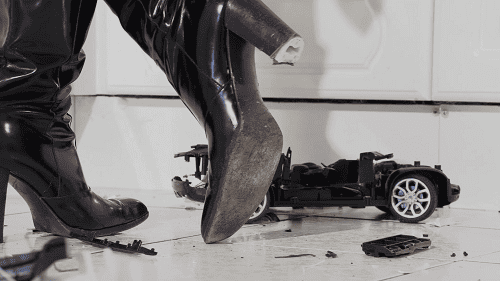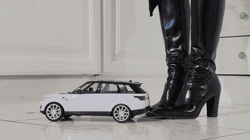 In Lady Roxanne's first video shoot, she is toying with a radio controlled car. It is brand new but old and worn batteries have been put into it. As a result, the car only judders and does not work very well. Disappointed, Roxanne decides that there must be 'consequences'. So she decides to crush it and smash it beneath the heels of her expensive patent leather boots.