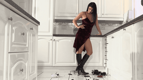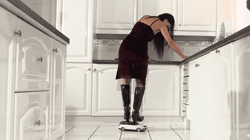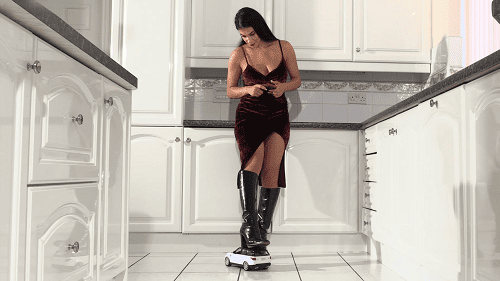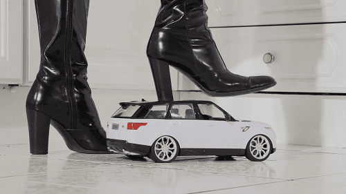 In Lady Roxanne's first video shoot, she is toying with a radio controlled car. It is brand new but old and worn batteries have been put into it. As a result, the car only judders and does not work very well. Disappointed, Roxanne decides that there must be 'consequences'. So she decides to crush it and smash it beneath the heels of her expensive patent leather boots.