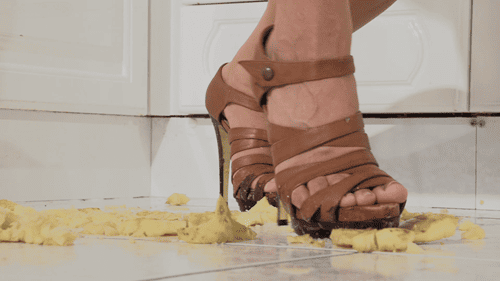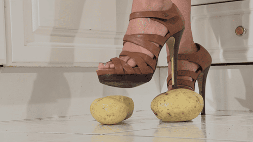 Roxanne has fun crushing a couple of potatoes with her sharp wooden high heels, digging them right into the potatoes before crushing them completely to mush.