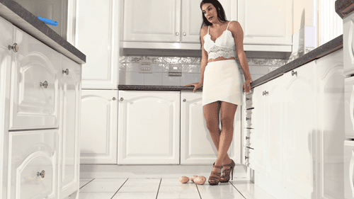 Roxanne has fun crushing a couple of potatoes with her sharp wooden high heels, digging them right into the potatoes before crushing them completely to mush.