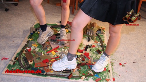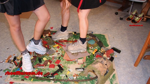 Sie spielen mit Waggons, gehen über eine Eisenbahnanlage und zertreten alles unter ihren Füßen.