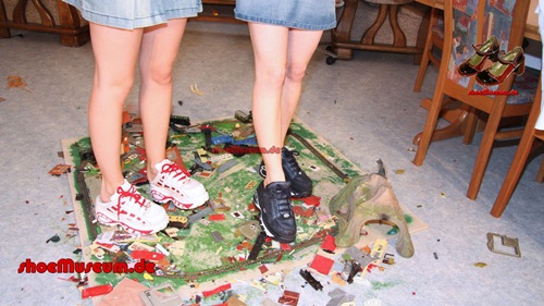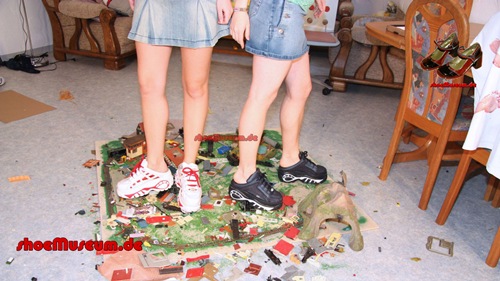They play with toy waggons and walk over a toy railway and destroy it under their feet.