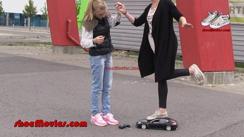 Sie spielen mit einem Modellauto, stellen sich darauf und haben Spaß damit.