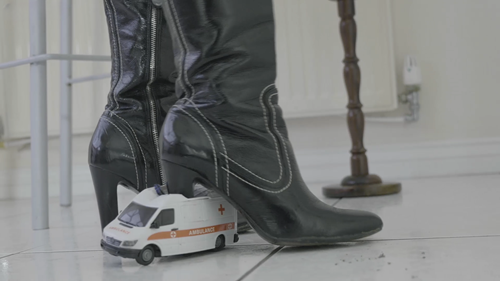 Victoria loves smoking. To enjoy herself, she has the idea to smoke a cigarette whilst destroying a toy car to bits underneath her boots.