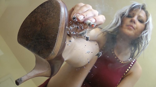 Watch me smoke and crush a cigarette with my high heels underneath the glass table!